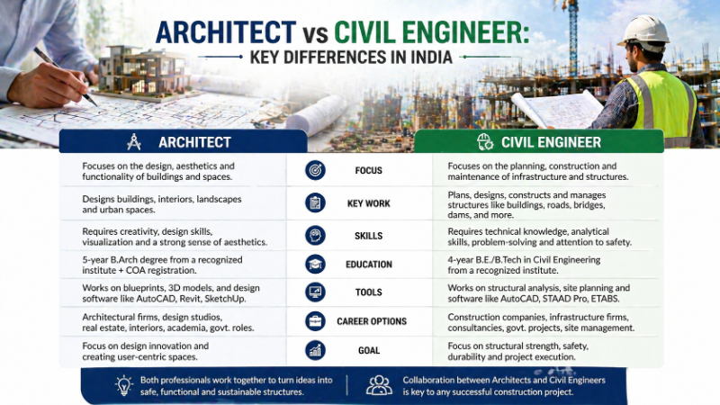Understand the key differences between architects and civil engineers in India. Learn their roles, qualifications, and when to hire each professional.