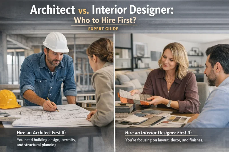 You should typically hire an architect first, especially if your project involves structural changes, new construction, or significant renovations. Architects handle building codes, structural safety, and regulatory compliance, while interior designers focus on aesthetics and furnishings after the structural framework is established.
