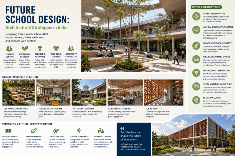 Explore modern architectural strategies transforming school design in India. Learn about flexible, sustainable, and student-centric educational spaces.