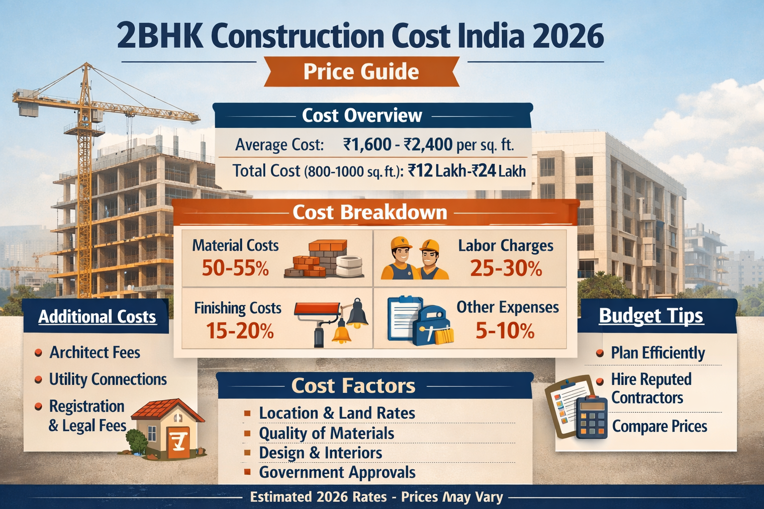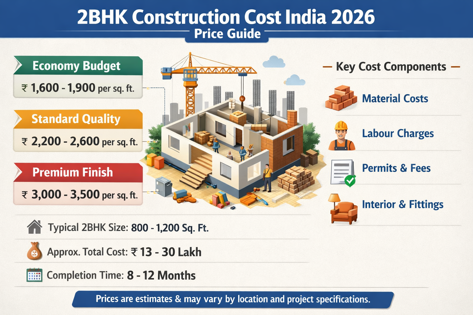 As of 2026, the average construction cost for a 2BHK apartment in India ranges from ₹35 lakhs to ₹1.5 crores, translating to approximately ₹1,200 to ₹5,000 per square foot. The exact cost depends on factors like location, construction quality, local labor rates, and regulatory requirements.