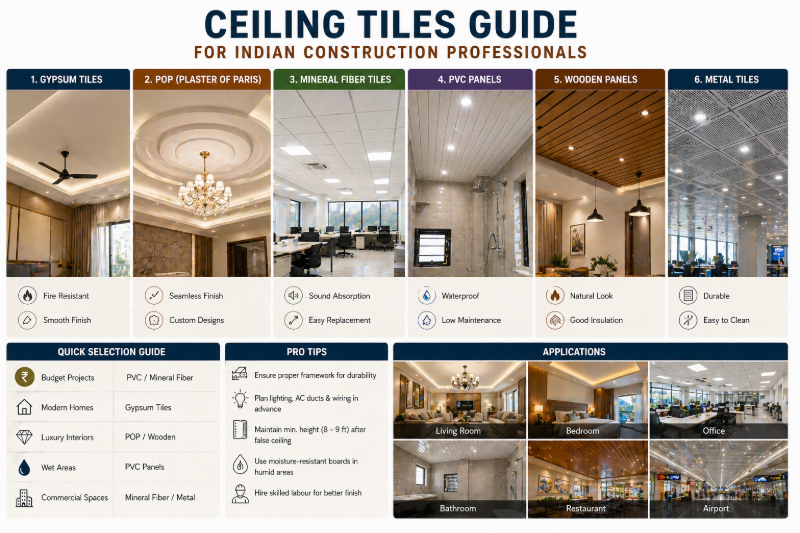 Complete guide to ceiling tiles for Indian construction. Learn about types, materials, acoustic control, thermal insulation, and installation best practices.