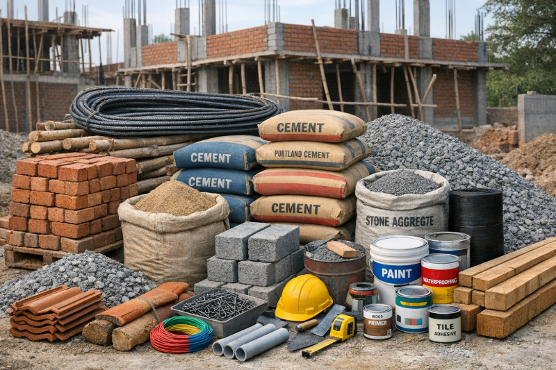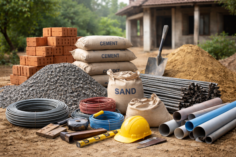 Complete guide to construction materials needed for building a house in India. Learn about foundation, walls, and structural components.