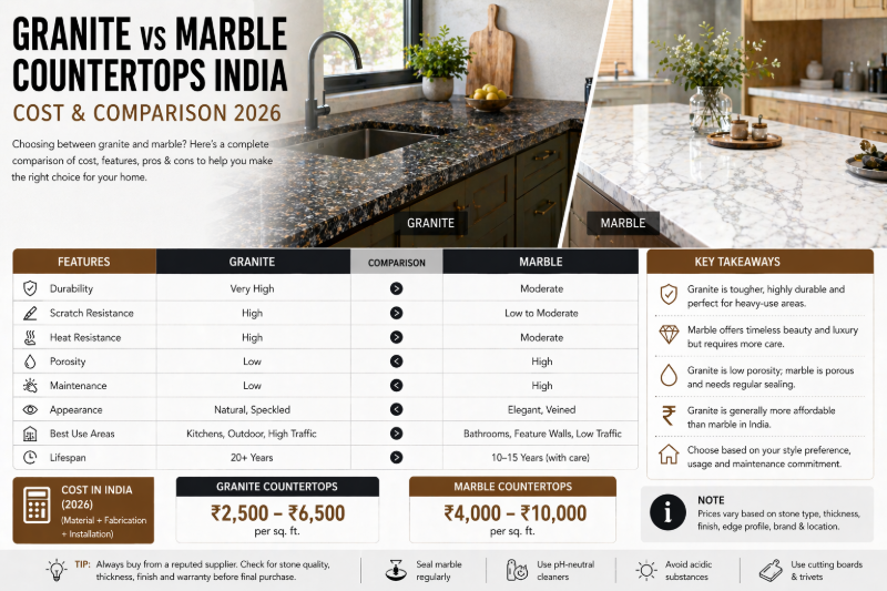Compare granite vs marble countertops in India. Get pricing, durability, maintenance costs & expert tips to choose the best option for your kitchen.