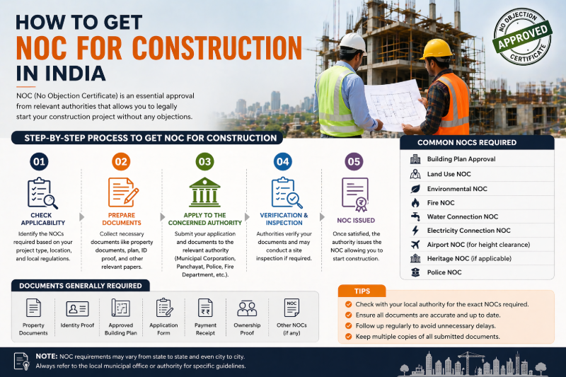 Learn how to obtain NOC for construction in India. Step-by-step guide covering requirements, authorities, and process for residential & commercial projects.