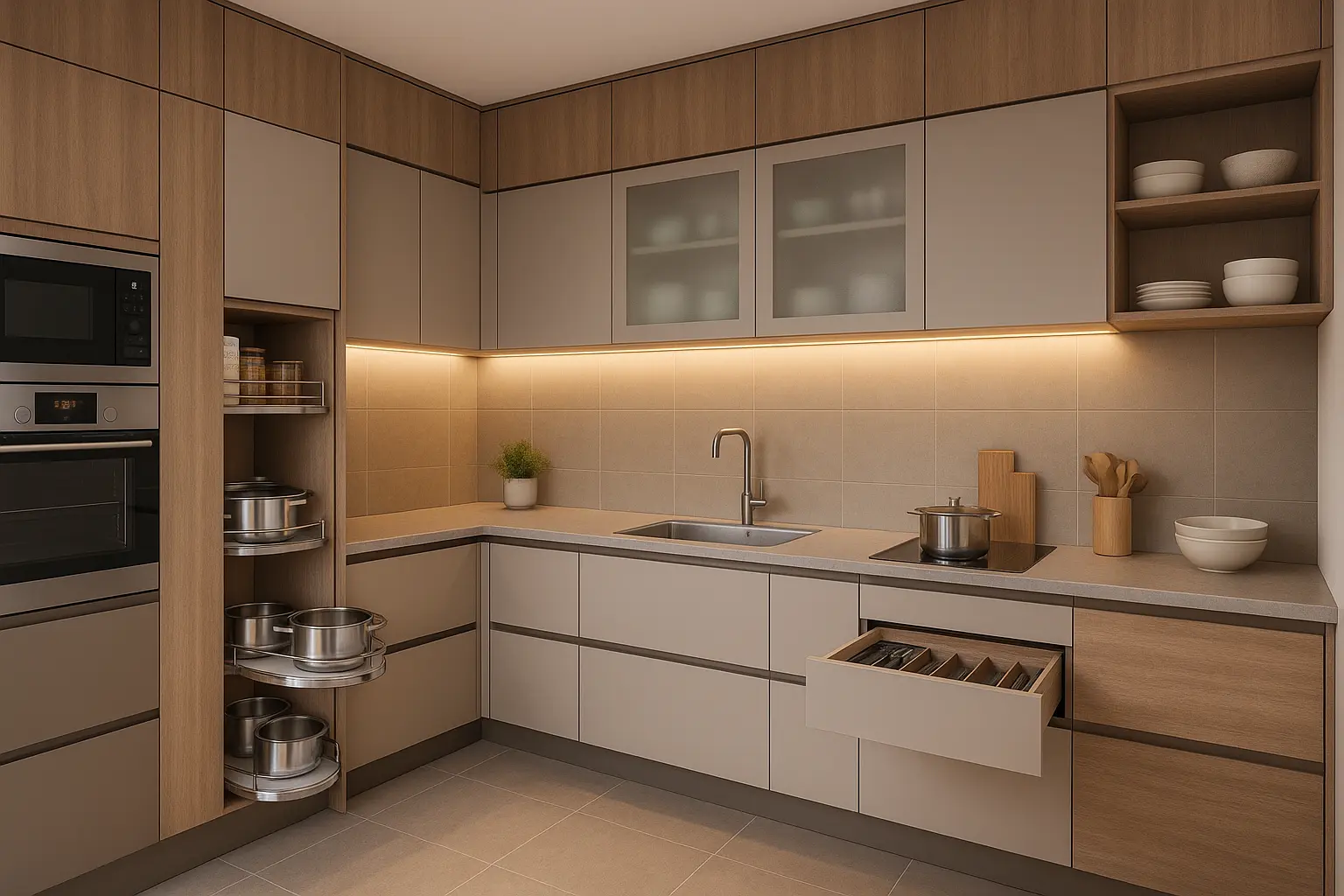 These costs depend on the complexity of your kitchen layout and existing infrastructure. In cities like Hyderabad and Pune, plumbing and electrical work may be slightly less expensive than in Mumbai or Delhi.