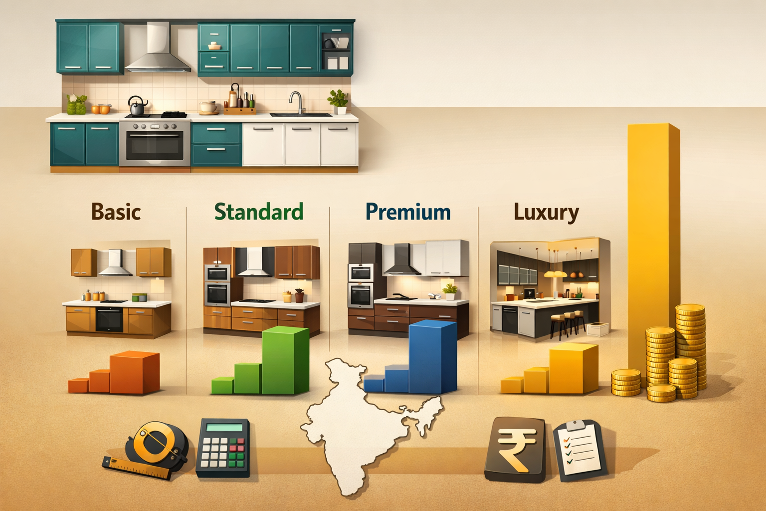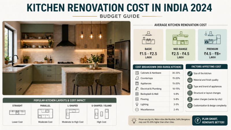 Complete kitchen renovation cost guide for India 2024. Learn pricing for basic, mid-range & luxury kitchens. Budget ₹2L-₹15L+ based on size & materials.