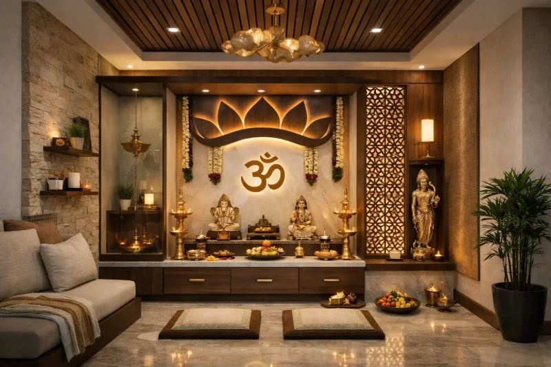 Explore modern pooja room designs in India 2026. Blend traditional spirituality with contemporary aesthetics, minimalist trends, and smart home technology.