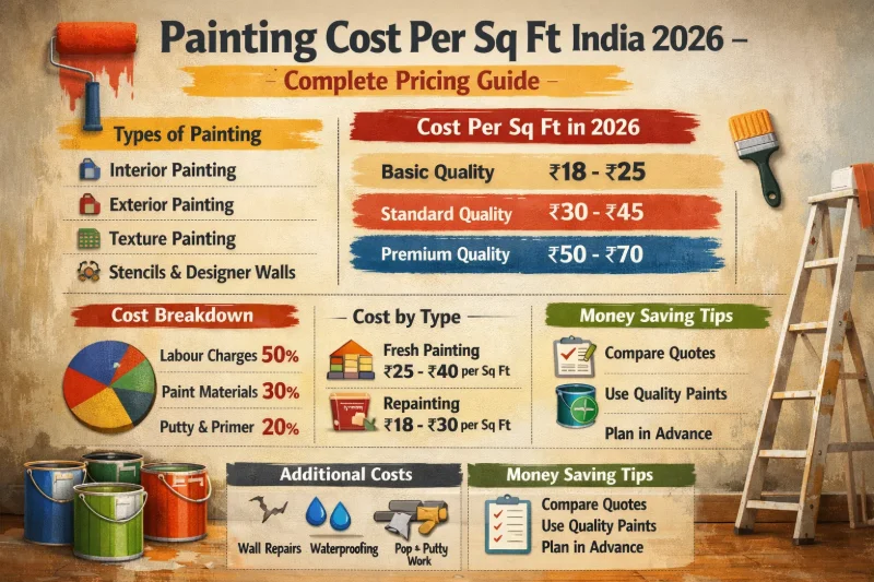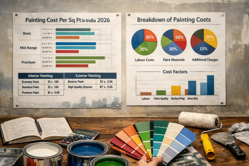 Get accurate painting costs per sq ft in India 2026. Interior, exterior & commercial rates, factors affecting prices, and budget planning tips.