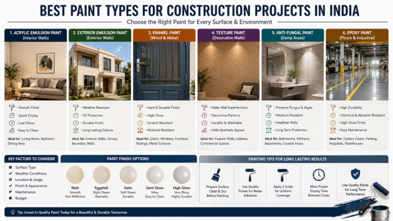 Complete guide to choosing the right paint for Indian construction projects. Compare emulsion, enamel, and other paint types with costs and applications.