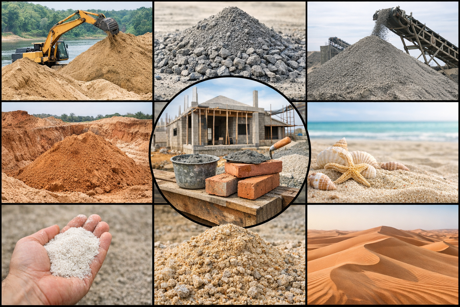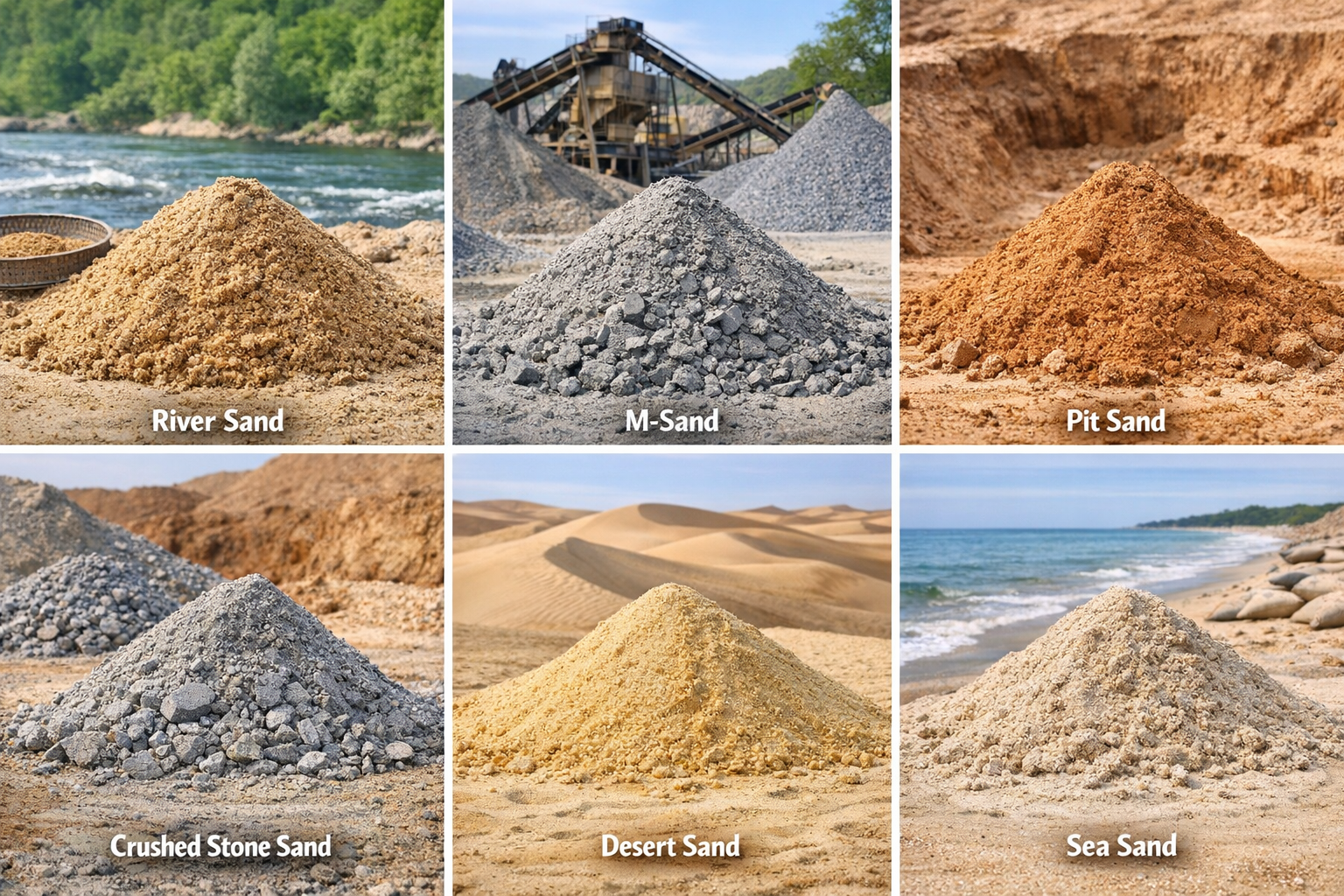 Comprehensive guide to sand types used in Indian construction. Learn about river sand, sea sand, manufactured sand, properties, and selection tips.