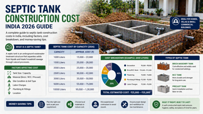 Complete guide to septic tank construction costs in India 2026. Learn pricing, factors affecting costs, and budgeting tips for residential & commercial properti