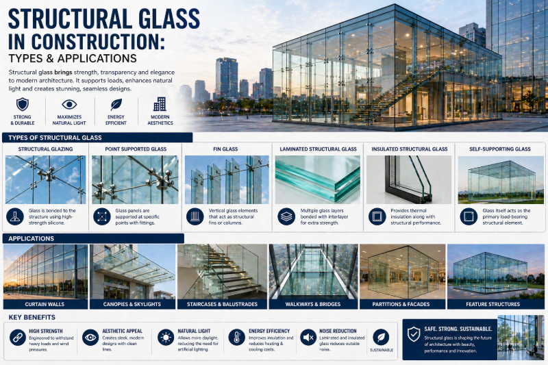 Explore structural glass types including laminated, tempered, and IGUs. Learn applications in modern architecture and construction across India.