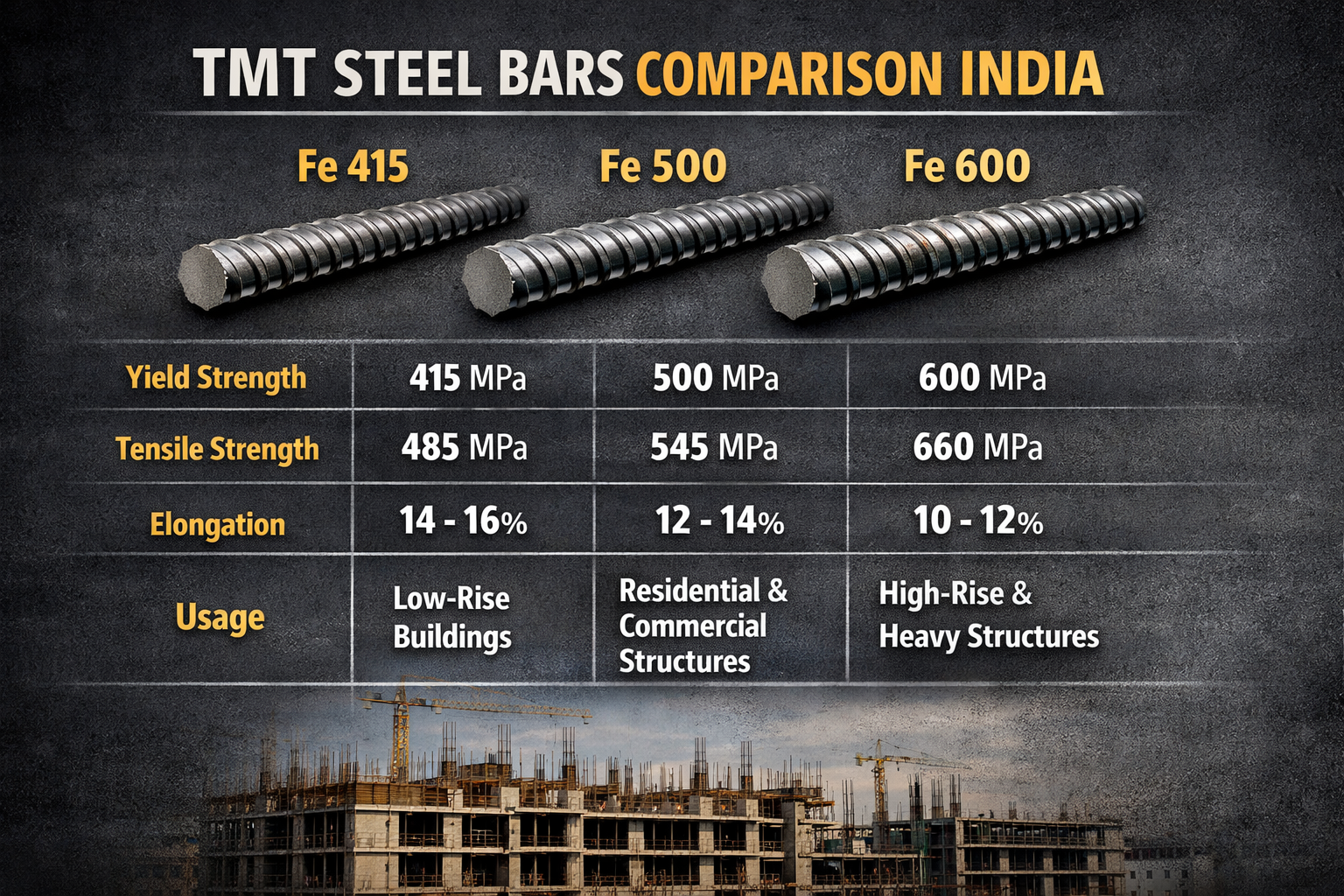 Compare TMT steel bars in India: Fe 415, Fe 500, Fe 600 grades. Learn yield strength, properties, applications & costs for construction projects.
