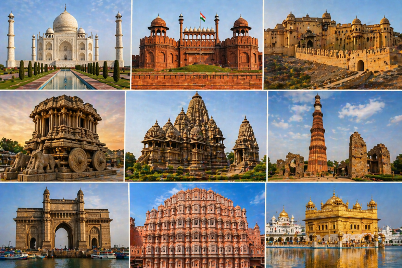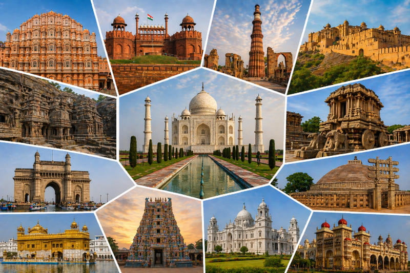 Explore India's most iconic historic buildings from Taj Mahal to Red Fort. Complete architecture guide with visitor info and heritage sites.