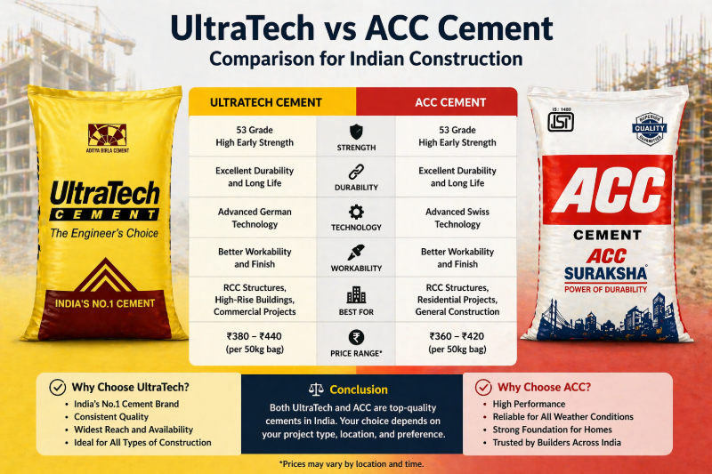 Compare UltraTech and ACC cement for Indian construction. Analyze quality, pricing, performance, and availability to choose the best cement for your project.