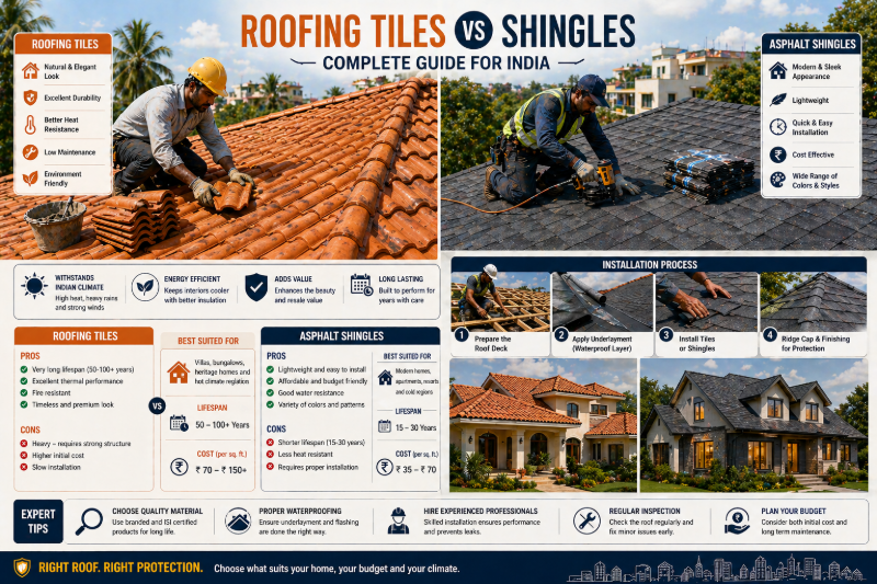 Choosing between roofing tiles and shingles is crucial for your property's durability, aesthetics, and maintenance costs, with clay tiles offering 50-100+ year lifespans and superior thermal insulation despite higher upfront costs, while shingles provide lighter weight and easier installation at lower prices. Understanding the distinct composition, installation methods, and longevity of these materials helps property owners in India make informed decisions based on their climate conditions, budget, and architectural preferences. Clay tiles remain a traditional choice in regions like Tamil Nadu and Kerala, while asphalt and composite shingles have become increasingly popular in urban areas due to their affordability and ease of installation.